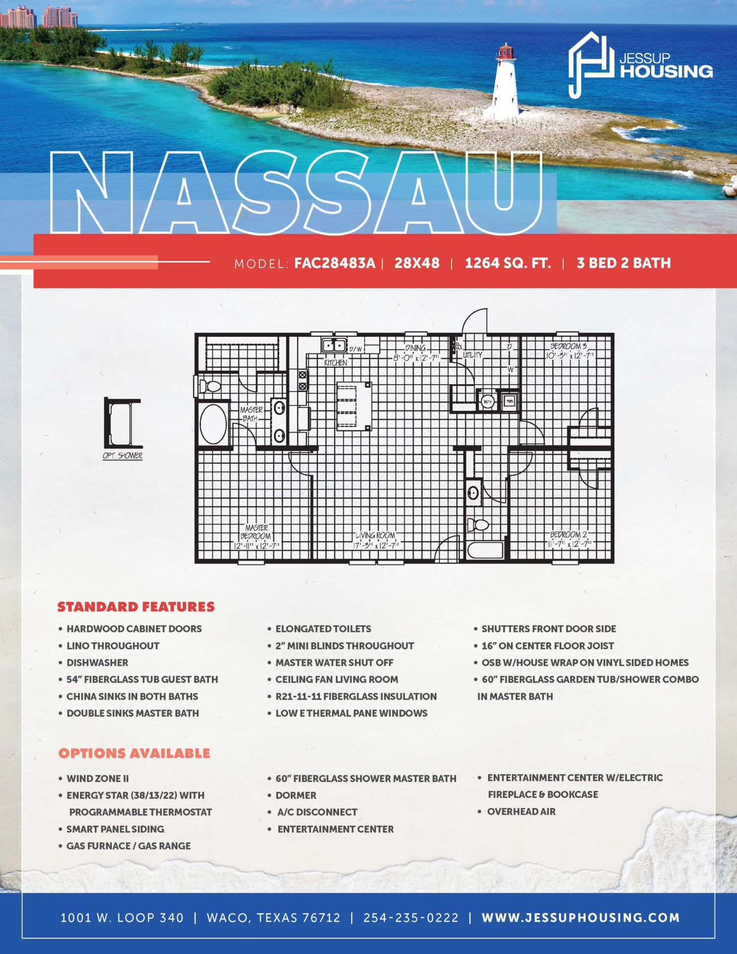 On DisplayOn SaleThe Jessup Nassau manufactured home, offered by Ozark Home Center, exemplifies modern living with its spacious and innovative design. This stunning home features three bedrooms and two bathrooms, spread over a generous 1,500 square feet of living space, making it ideal for families or those seeking extra room. The open-plan living and dining area is accentuated by large windows, bathing the space in natural light and creating a welcoming atmosphere. The home comes equipped with state-of-the-art appliances and finishes, blending functionality with style. Come see us in Hot Springs, AR today!